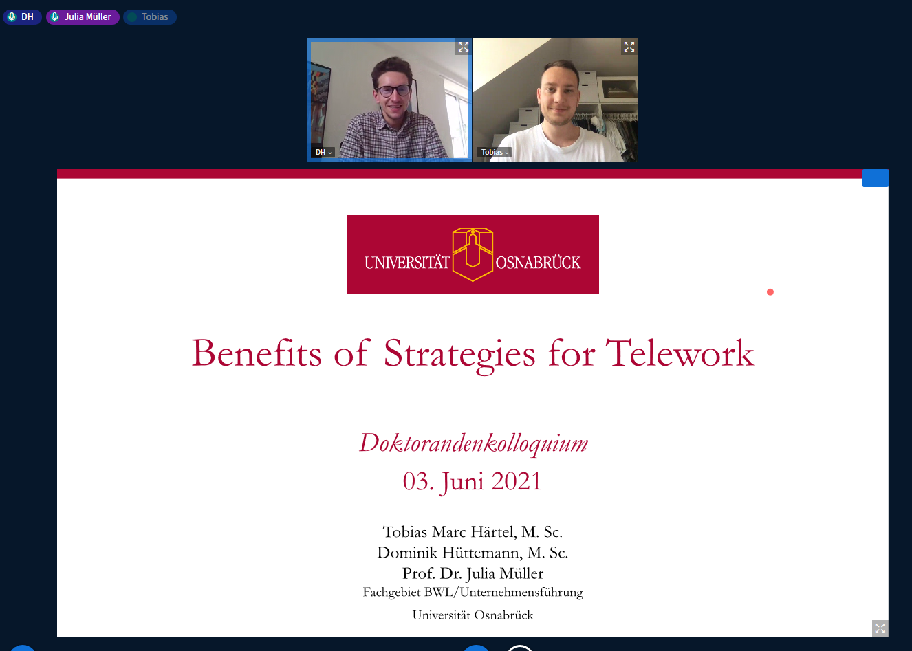 Unsere Doktoranden Tobias Marc Härtel und Dominik Hüttemann präsentierten den aktuellen Ergebnisstand in ihrem Forschungsprojekt "Benefits of Strategies for Telework".